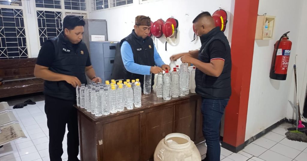 Dalam operasi tersebut, petugas mengamankan sejumlah barang bukti dari seorang pelaku berinisial ISF yang biasa dipanggil F. Barang bukti yang disita berupa 20 botol besar arak Bali, 91 botol kecil arak Bali serta satu jeriken berisi sekitar 5 liter arak Bali yang diduga merupakan bahan oplosan.